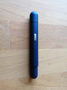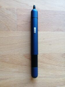 Ein wirklich außergewöhnlicher Kugelschreiber, ein „Pocketpen“. Als ich ihn zum ersten Mal in der Hand hielt, war ich doch sehr überrascht, wie klein er ist. Ich kannte ihn ja nur von Bildern. Tatsächlich ist er nur gute 9 cm lang und nicht viel dicker als ein normaler Kugelschreiber. Mit einem Stift, der nur etwas länger ist als ein Lippenstift, kann man natürlich nur mühsam schreiben. Aber die Verwunderung war groß, wie lang er wirklich wird, wenn er ausgefahren ist: 12 cm! Das geht mit einer ziemlich raffinierten Mechanik, die einen großen Teil des Stiftes im Inneren versteckt und nach einem Druck auf das Hinterteil freigibt. Dabei fährt die Spitze aus und der Stift verlängert sich – absolut faszinierend. Da merkt man, dass viel Hirnschmalz in die Entwicklung investiert wurde. Auch das leicht erhabene, silberne LAMY-Zeichen hat einen Sinn: da der Stift keinen Clip hat, kann er somit nicht vom Tisch rollen. Clever.